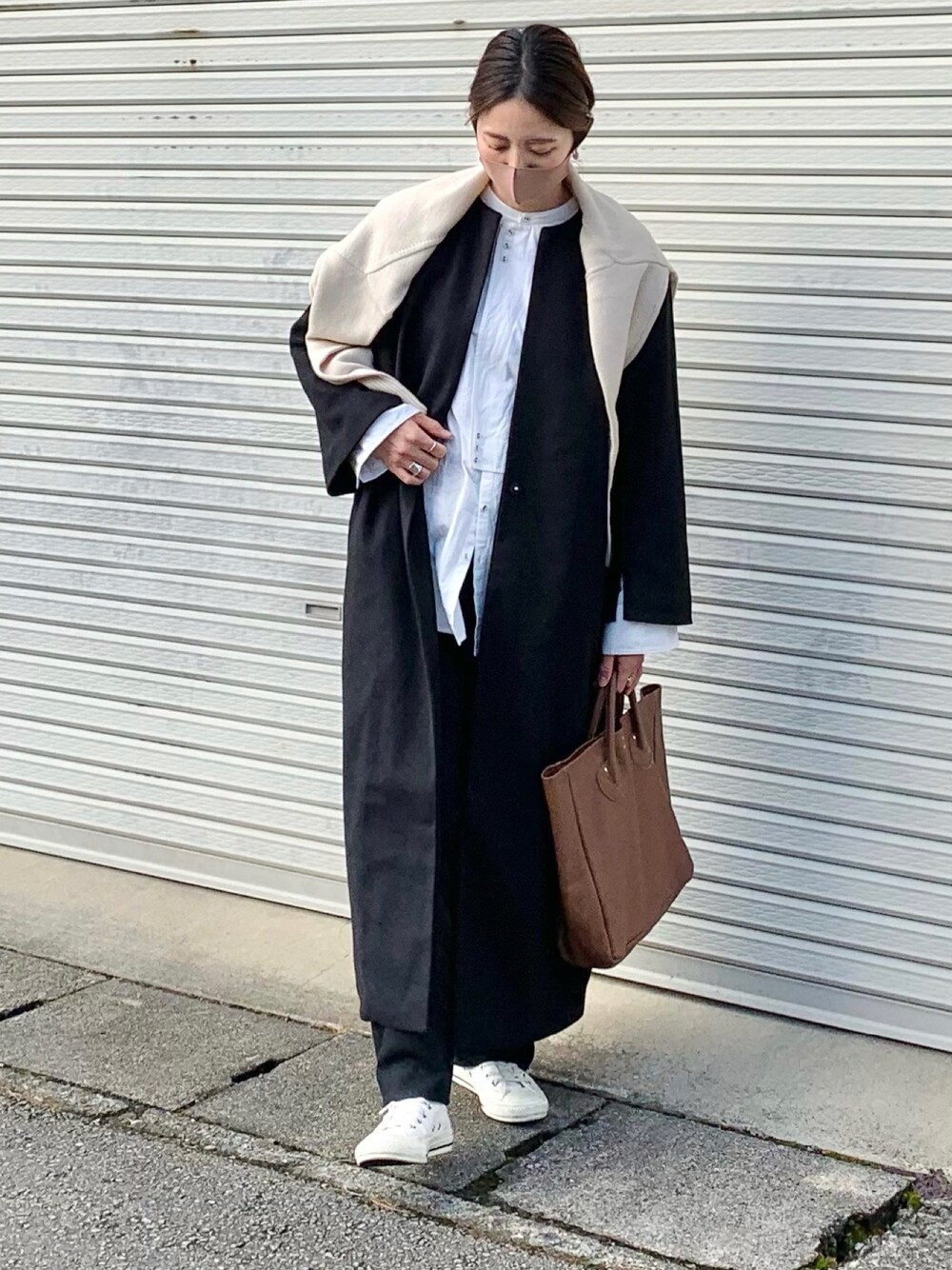 たろ☺︎のノーカラーコート「ノーカラーメルトンロングコート」を使ったコーディネート