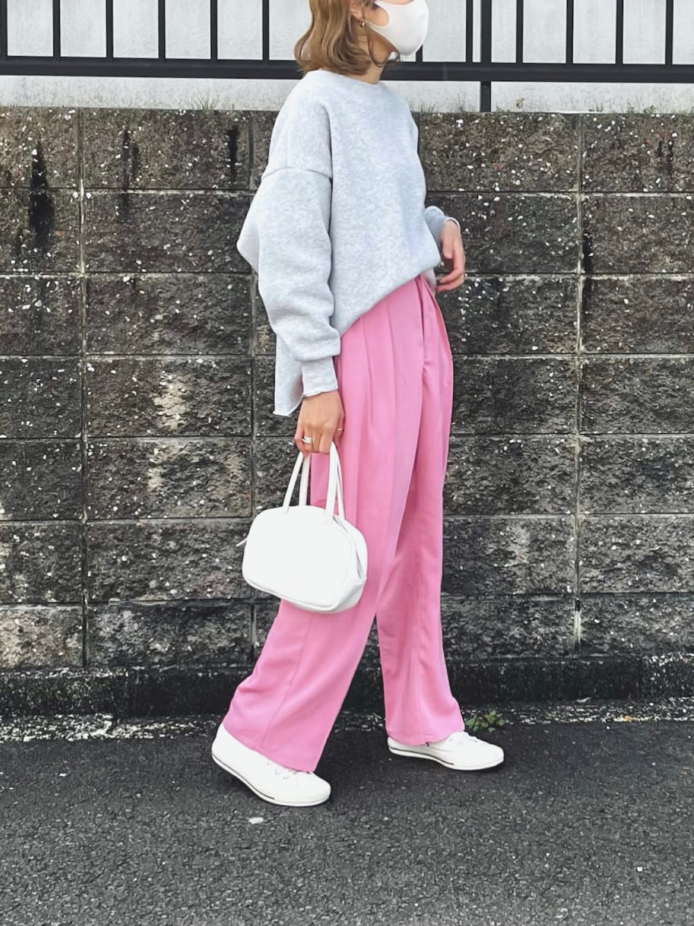 ピンク。 黄みピンクかなぁと思ったら、青みピンクやったかな。 でもコレはコレで◎♡ グレーのスウェットと。 Instagram→@instaro__