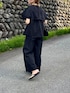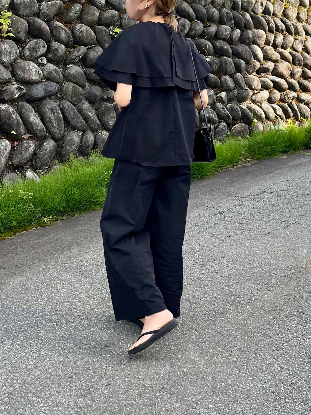 HANNEのフリルカラーチュニックブラウス。 これかわいいー♡ 大きいフリルも、ブラックなら甘くなりすぎない◎ 今日はオールブラックで。 ビーサン合わせも気分にピッタリ。 デニムや、カラーパンツと合わせてもかわいいやろなー♪
