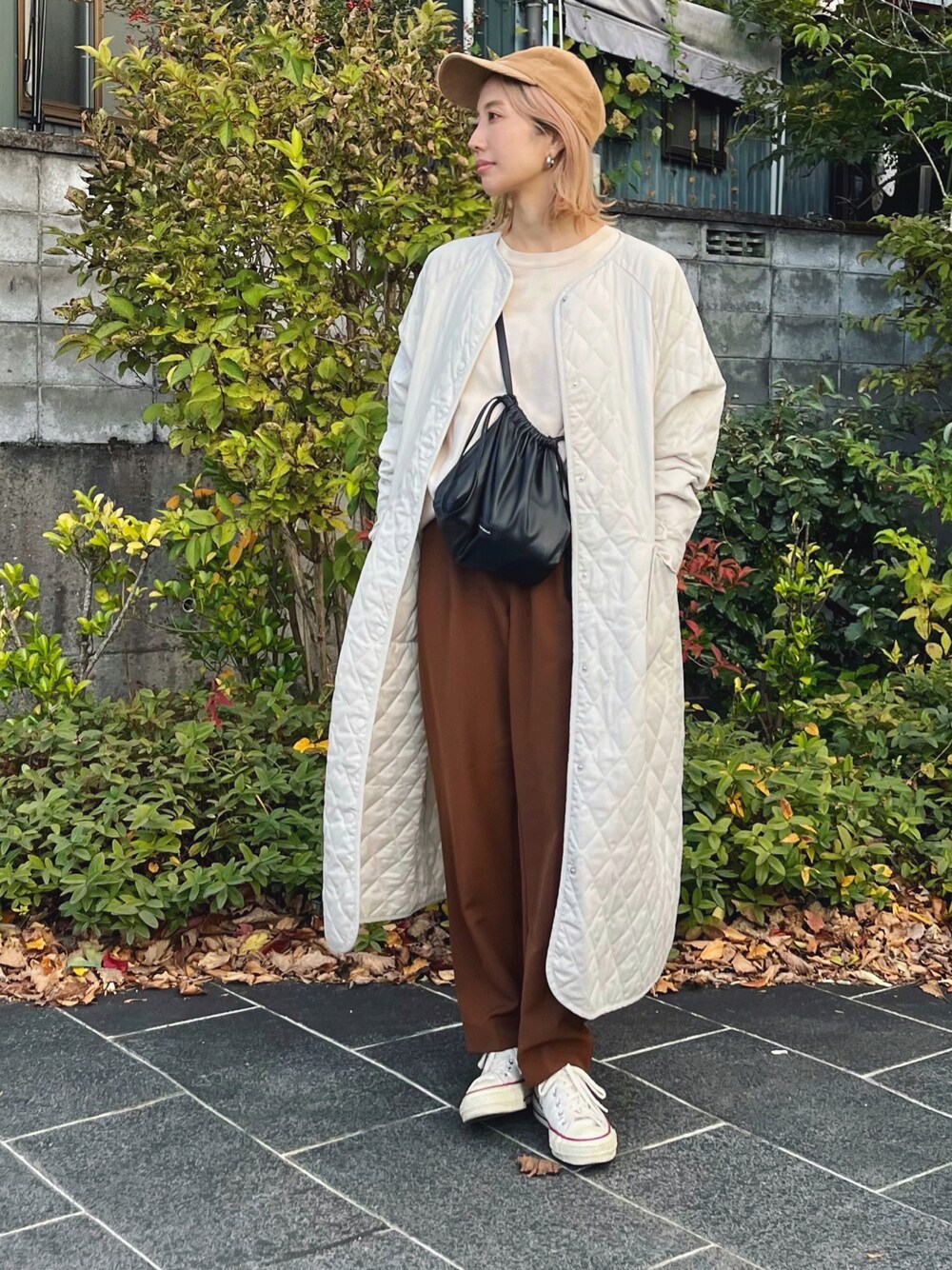 たろ☺︎のノーカラーコート「キルティングボリュームコート」を使ったコーディネート
