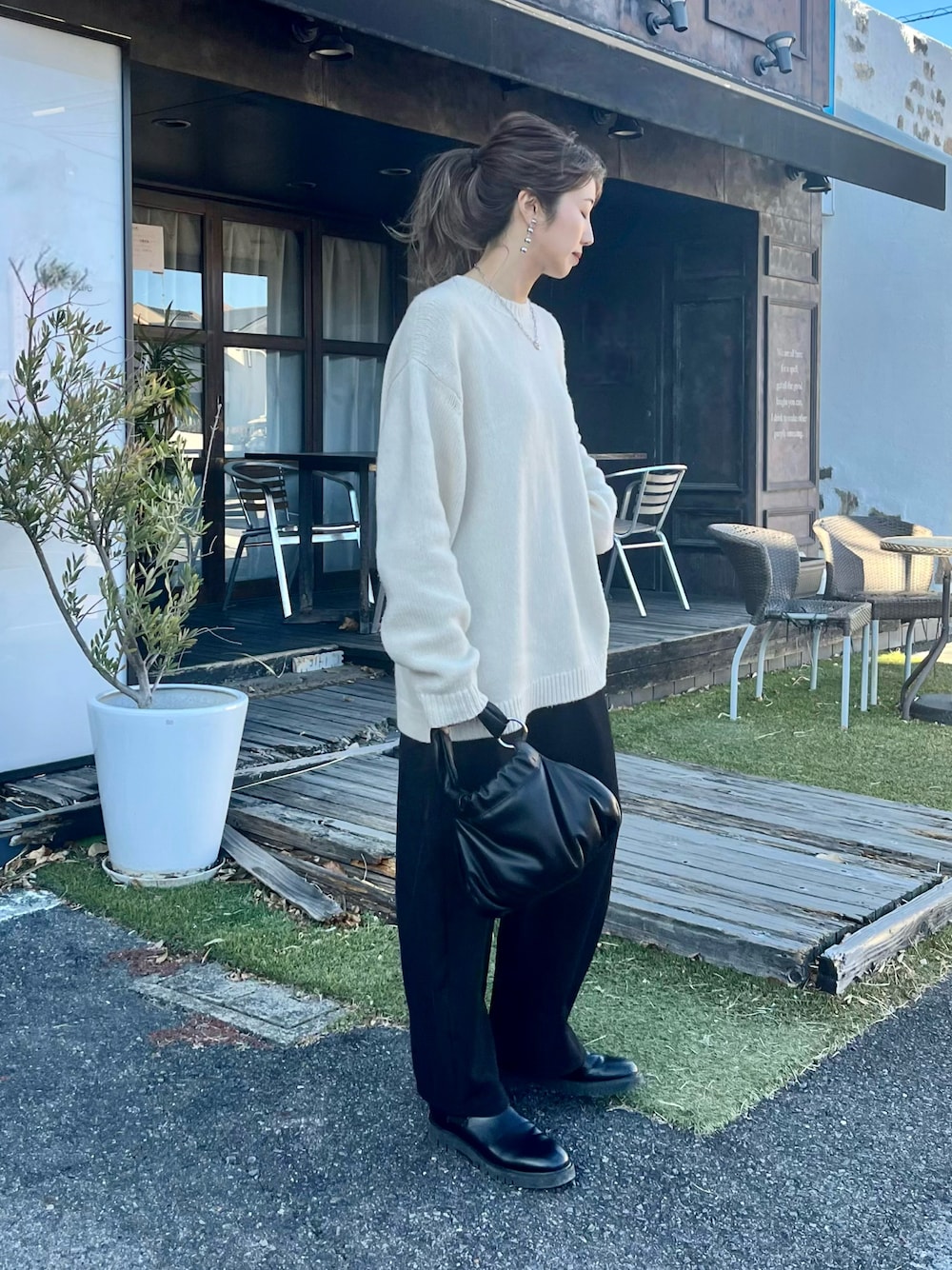 2024 今年もよろしくお願いします☺️ お気に入りのニットとめずらしくポニーテールで。 そしてこのパンツのシルエットほんとかわいい! Instagram→@instaro__