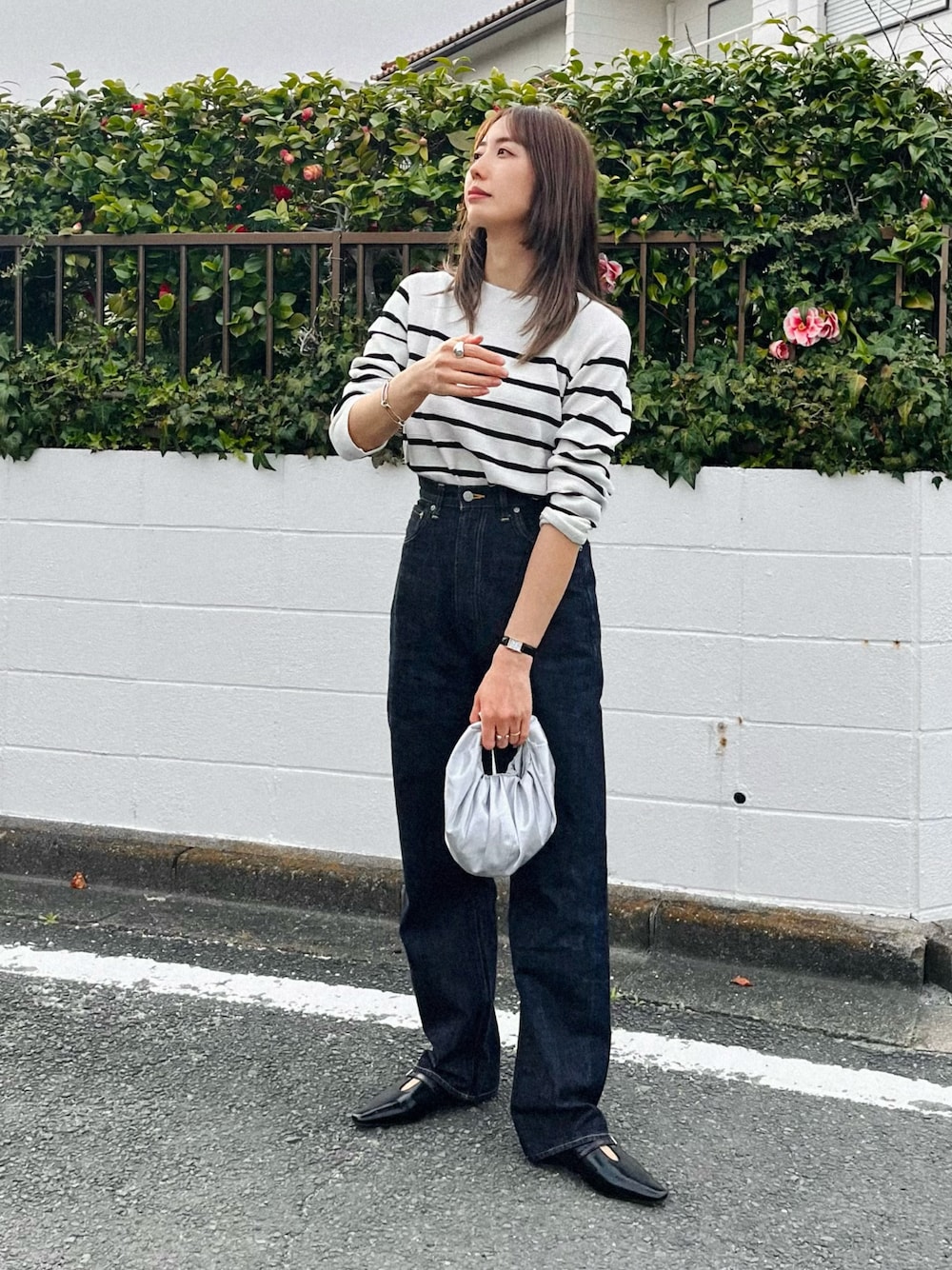 オペークドットクリップのボートネックニット。 よく見るとデザイン性のある編み目が、シンプルな中にも表情があってステキ◎ 定番のボーダー×デニム合わせだけど、小さいシルバーのバッグとトンガリパンプスでカジュアル過ぎないようにしたよ◎ Instagram→@instaro__