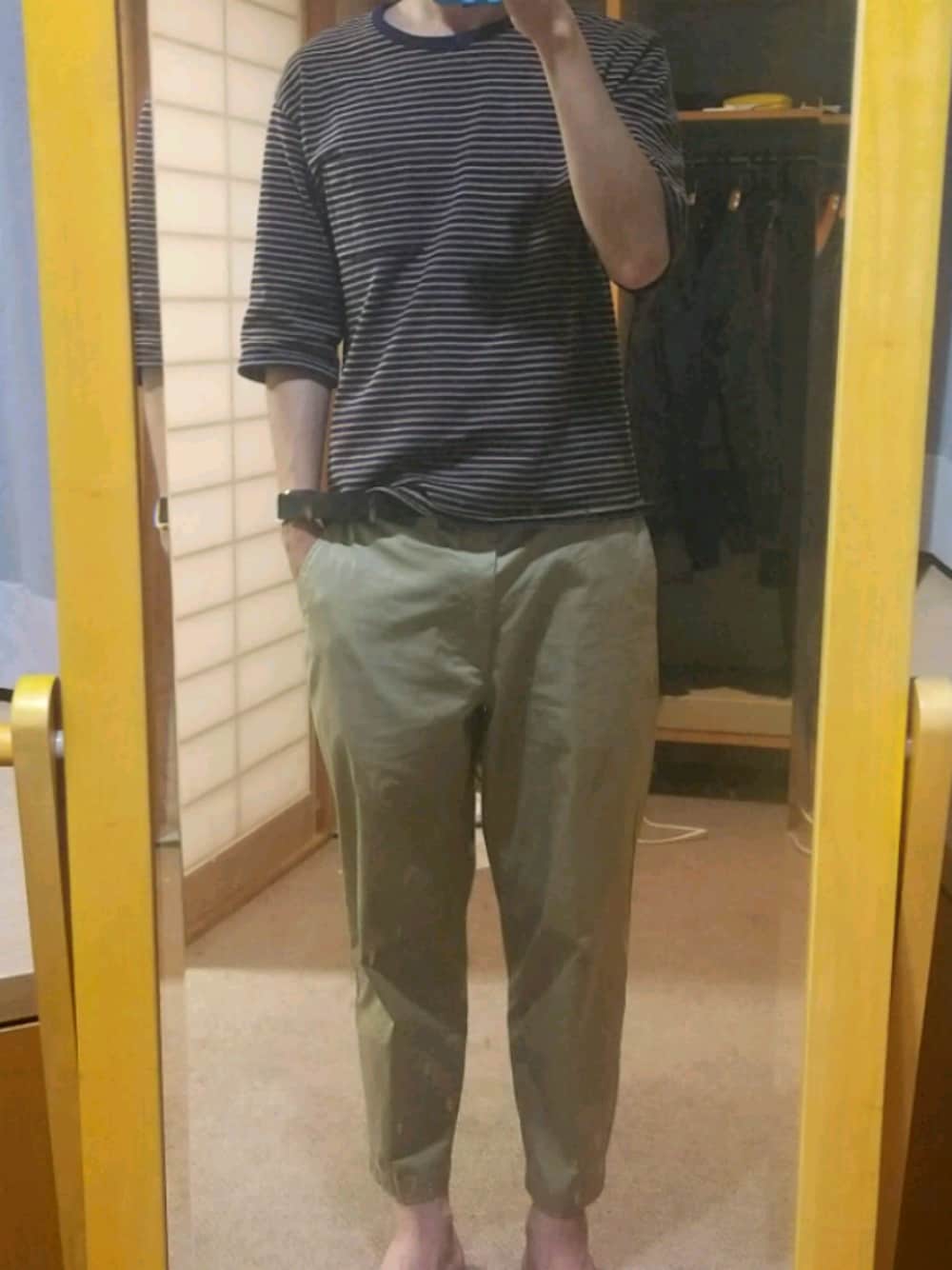 ネイビーとベージュのボーダー気に入った アースカラーが落ち着く 足元はブラウンのローファーでした。