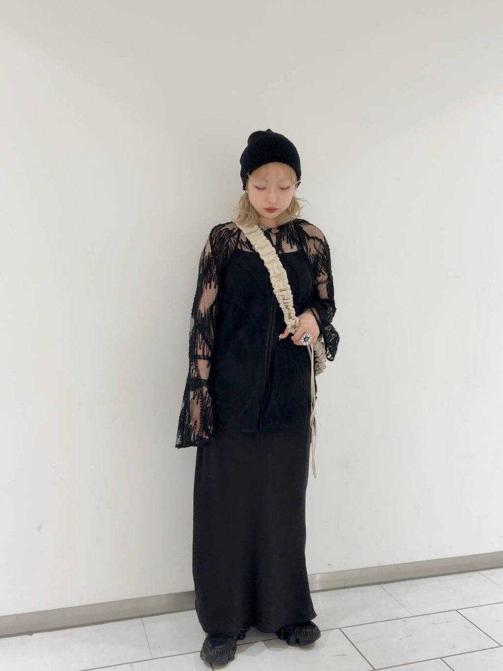 黒コーデ! バテンレースの透け感がほんとに可愛いです! バッグは今やっているポップアップのハンロデスコ🎶しっかり入るのでGWのおでかけにもおすすめです🚅