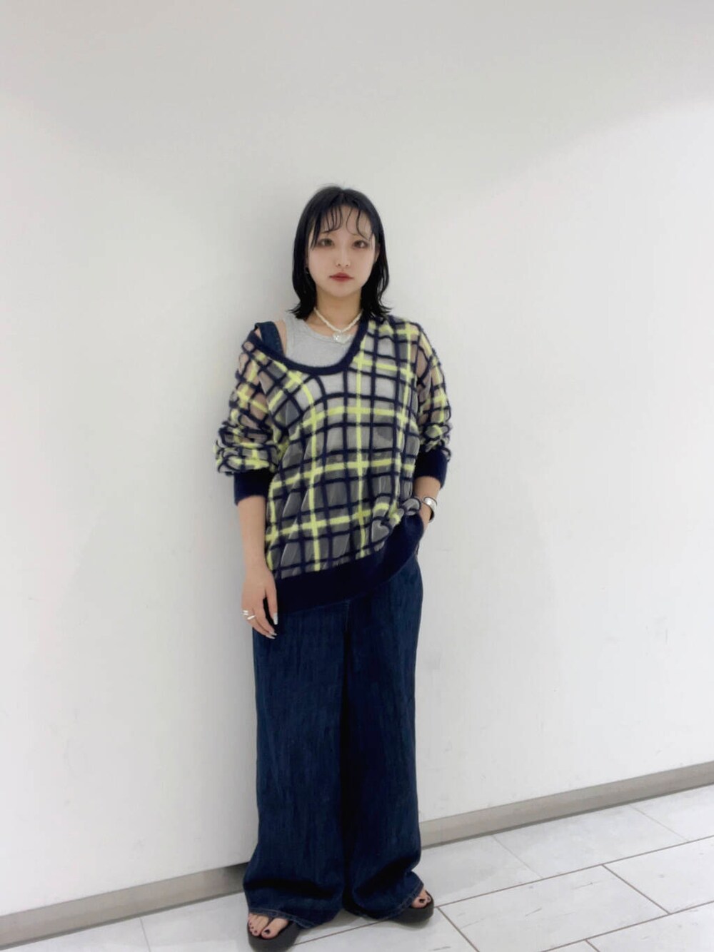 新作のシアーチェックニット🧶✅ デニムサロペットに重ねて着てます! 今季も人気のシアーチェックニット(⸌⸍)‼️ 即完の予感です、、、( ᷇ᯅ◝ )՞ ՞