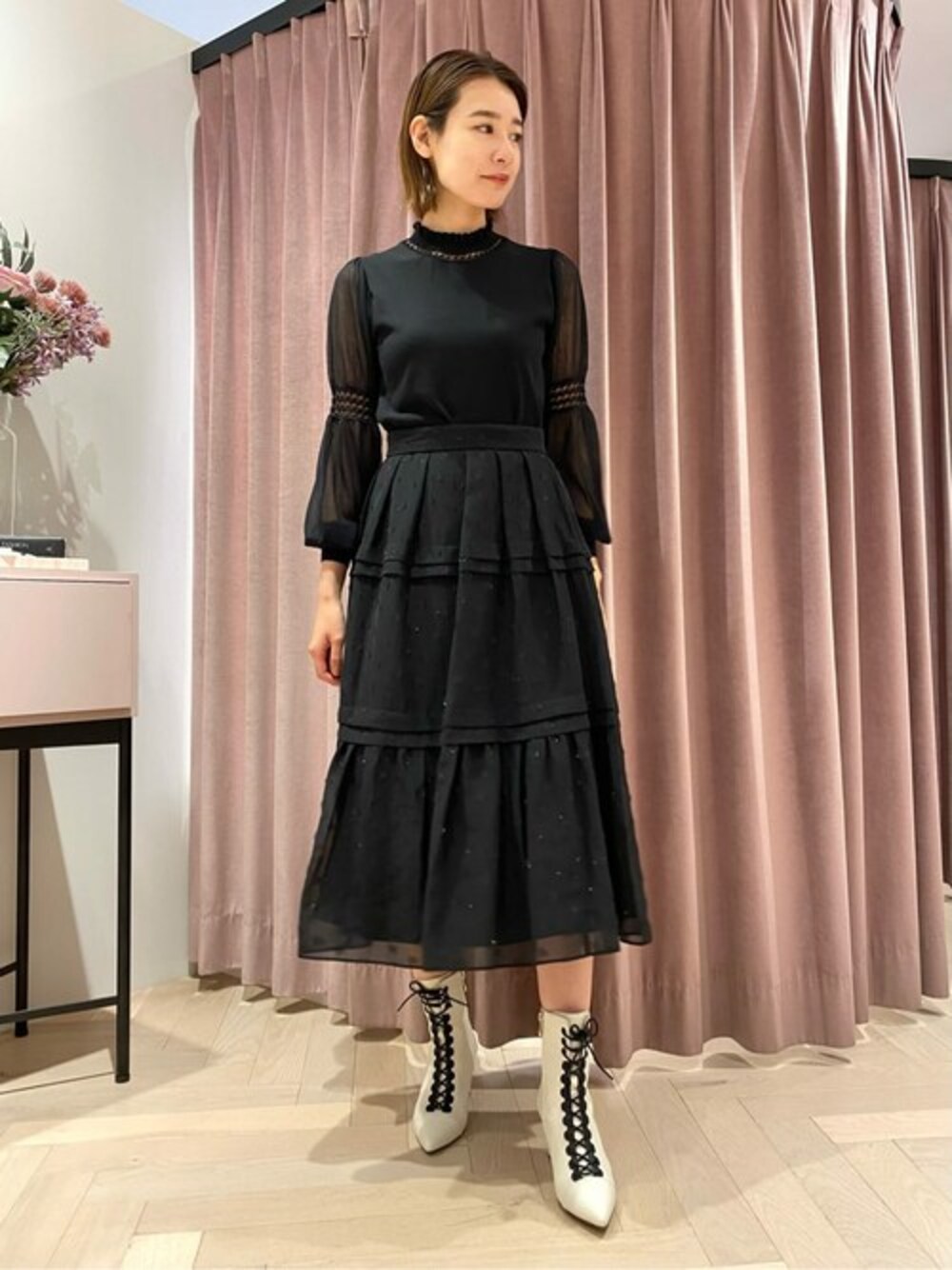 *162㎝ 【アミラニット】 普段サイズ:S / 着用サイズ:FR コットンポリエステルの生地を使用したさらっと滑らかな着心地です。 袖部分はシアー感のある薄さになっており、秋口に一枚で着やすいニットです。 ボディラインを拾わないシルエットでスカートやパンツ、キャミワンピースのインナーなど幅広く活用していただけます。 【ミラシャインドットスカート】 普段サイズ:2 / 着用サイズ:2 歩くとふんわりと揺れるシフォン素材の軽めのスカートです。 ラメドットなのでブラックでも重くなりすぎず、デイリー使いもしやすいデザインです。 同シリーズのブラウスとセットアップでドレッシーに、トップスを変えて着回しも効く一枚です。 普段サイズで丁度良いウエスト、丈感です。