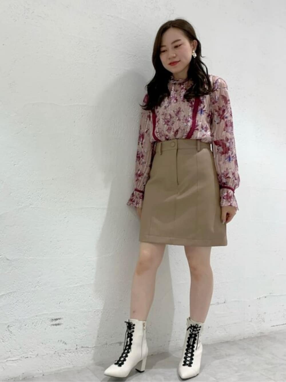 *152cm 【ケリーミックスフラワーブラウス】 普段サイズ:S / 着用サイズ:S サテンストライプとラメ糸の基布に大小2種類の花柄がプリントされ、さらに花柄と同色の刺繍レースを施した華やかなブラウスです。 袖口にはギャザーが入っているのでボリュームがかわいいです。 インナー付きなので安心してお召しいただけます。 【ドンナスカート】 普段サイズ:0 / 着用サイズ:0 いつものミニスカートよりももう少し短めな丈でトレンド感もあり、すっきりとしたコンパクトなシルエットや縦ラインの切り替えできれいに見せてくれます。 スナップボタンとファスナーで着脱もしやすいです。