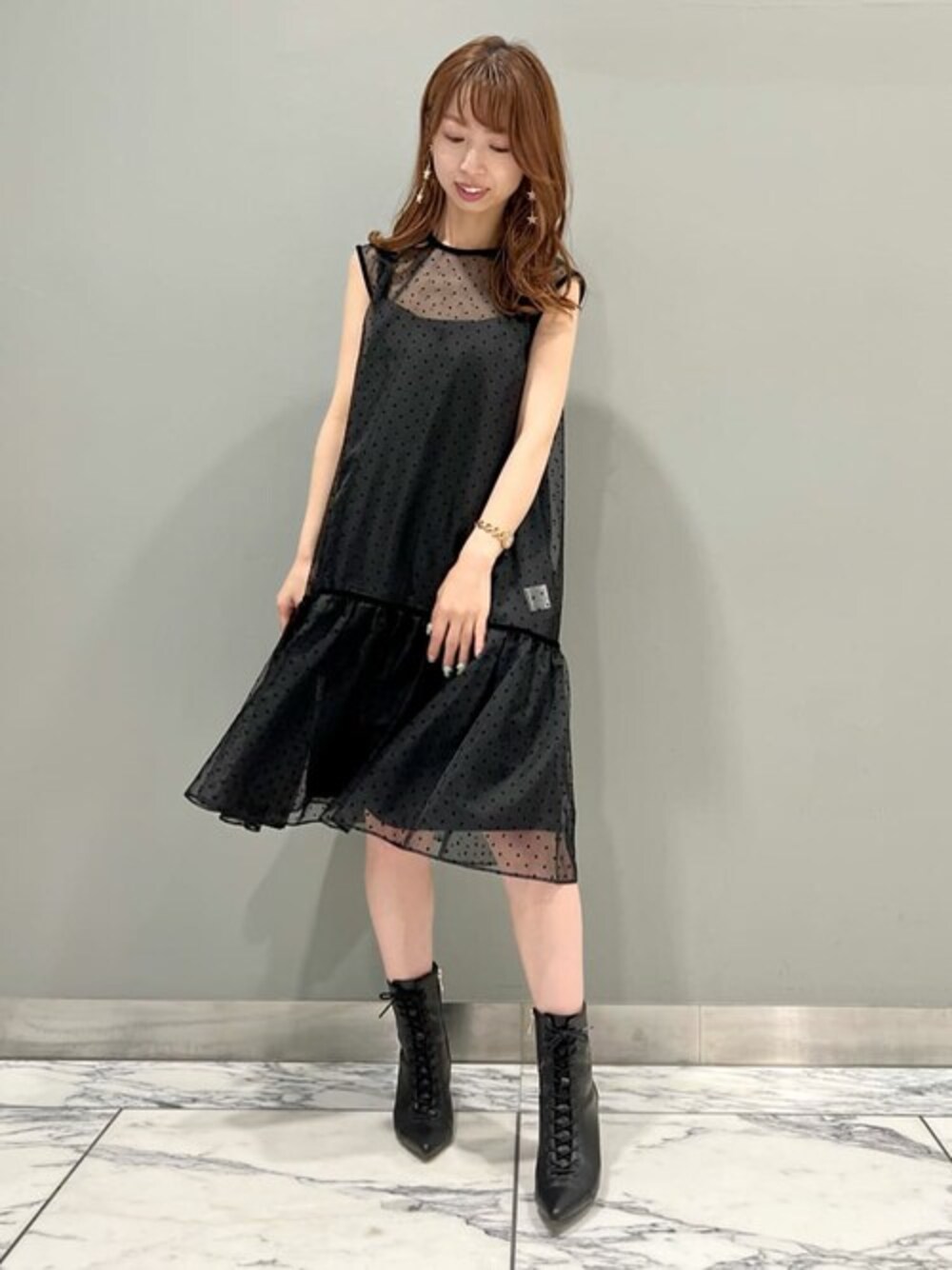 *155cm 【アグネスドットワンピース】 普段サイズ:0 / 着用サイズ:0 シルエット綺麗な大人可愛いワンピース。 中のインナーワンピースもしっかりとした生地感で、後ろの紐がクロスになってるのもポイントです。 一枚でフォーマルにも着ていただけますが、中にタートルを合わせてデイリーにも着られるので、着回しもたくさんしていただけます。 着脱は本体は後ろボタンでインナーワンピースは横ファスナーになります。