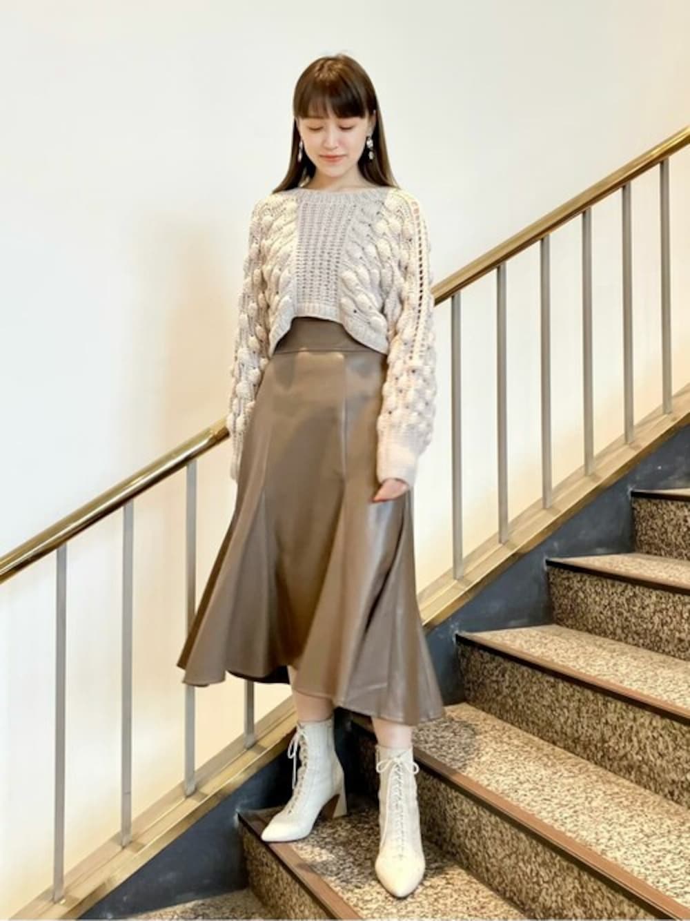 *162cm 【セレナニット】 普段サイズ:S / 着用サイズ:FR ざっくり編みのゆるシルエットが大人可愛いショート丈ニット。 ショート丈のためハイウエストボトムとの相性抜群でスタイルアップが叶います。 他にはないポコポコとしたデザインも一つ一つ手編みでこだわっており、大人な抜け感も出しつつ高級感のある一枚に。 一枚着や重ね着、色んな着回しを楽しんでいただけるニットです。 【レナマーメイドスカート】 普段サイズ:2 / 着用サイズ:0 履くだけでトレンド感の出せるマーメイドスカート。 JILLらしい大人ブラウンはフェイクレザーでお洒落度をよりランクアップして魅せてくれます。 スカートは丈感を考えて普段2を選びますが、こちらは前後で差を出していてバランスが綺麗なのとウエストも普段より若干ゆとりがあった為0を選びました。 柔らかいレザーなので見た目より履き心地も楽でおすすめです。