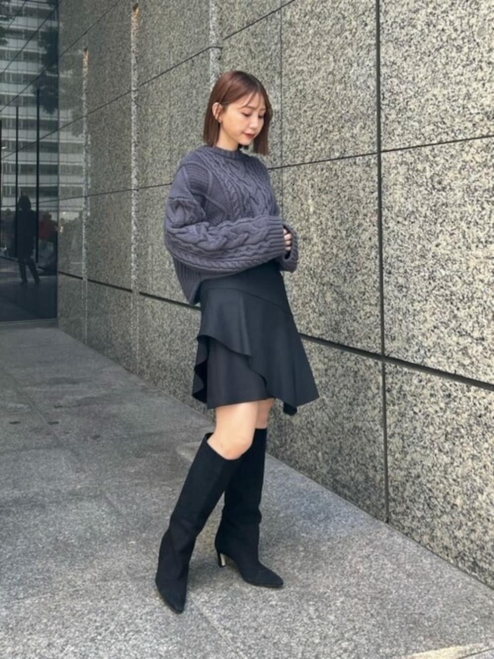 "【 トップス】 裾の長さがカーブになった短丈のケーブルニット。ハイウエストのボトムと相性良く、スタイルアップされます。 【 アシンメトリーフレアミニスカート】 アシンメトリーのデザインが珍しいミニスカート。短すぎず、大人でも履きやすいデザインになっています。 "