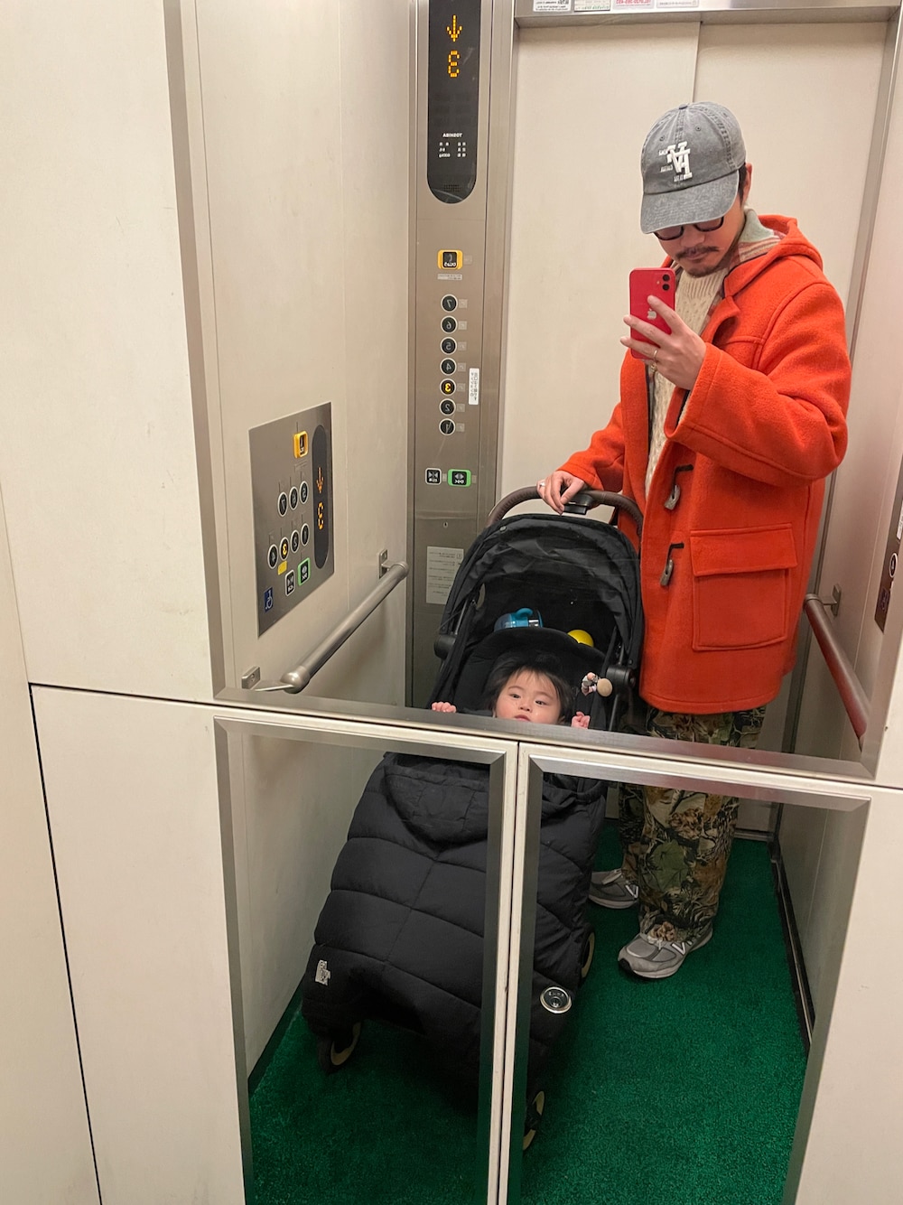鮮やかなオレンジのダッフルにリアルツリーカモのパンツで森の中で上半身だけが浮いているようなイメージでコーデを組みました。全体的にパンチの強いアイテムでコーデをしたので小物としてベビーカーと赤ちゃんを組み合わせることで、柔らかい雰囲気にまとめています。