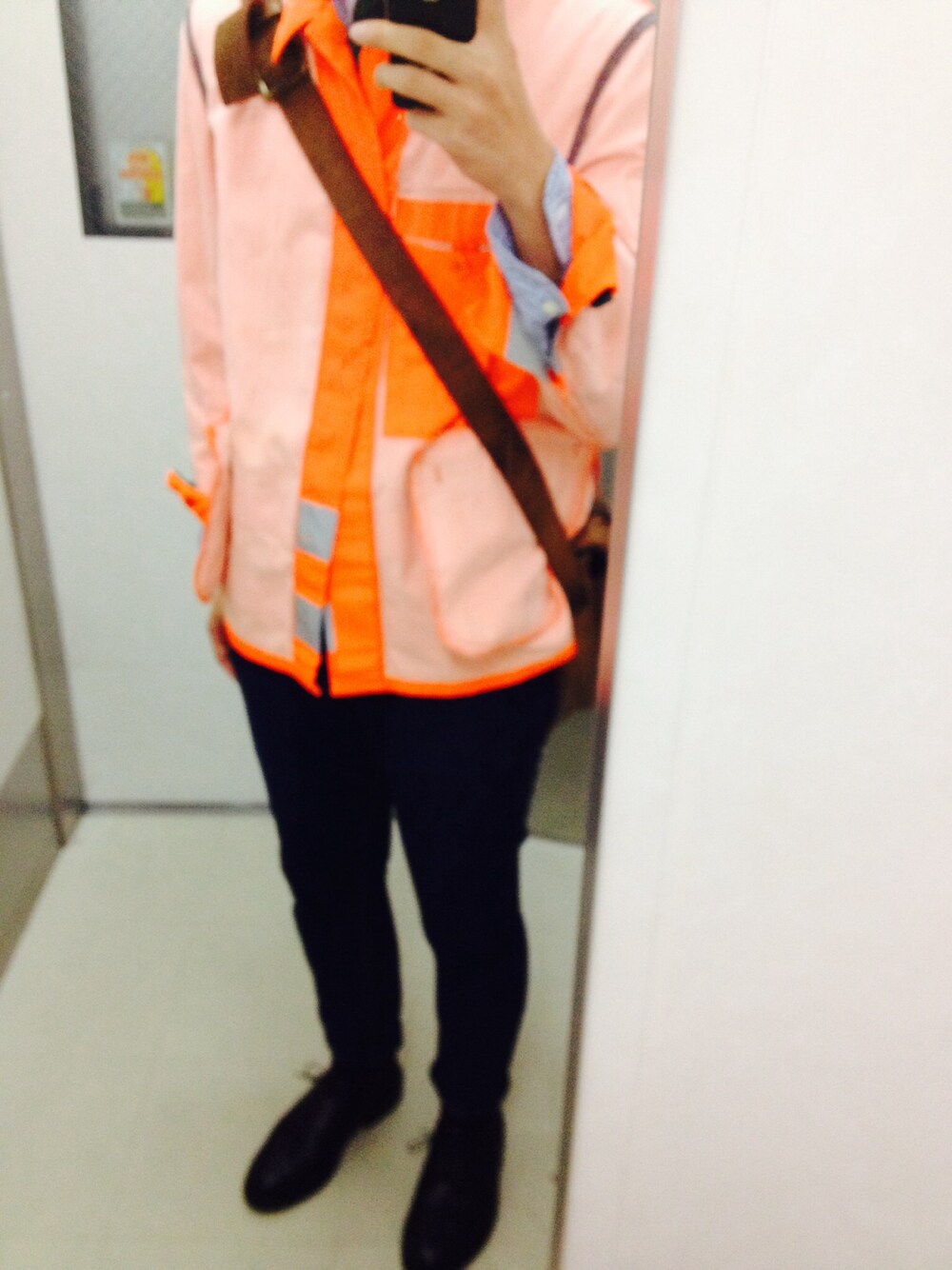 古きのワークジャケットを裏表逆さで。 消防士みたいな色です。