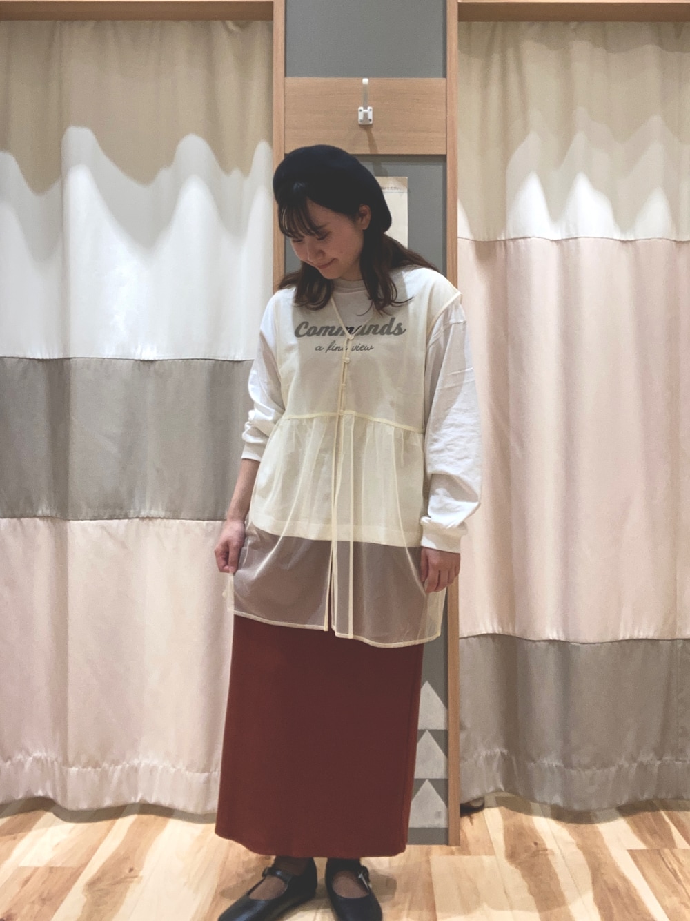 ご覧いただきありがとうございます🌰 ◯透け感が可愛いチュールジレ ロゴTとリブスカートで合わせてみました🤍 普段の格好に付け足すだけで トレンド感UP⤴︎ 2色展開でブラックもございます! 是非店頭にお立ち寄りください🌟