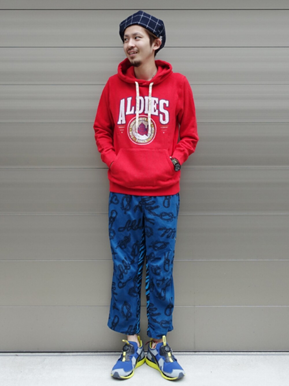 目の覚めるようなカラーリングでコーディネート。 カレッジパーカーのプリントはヴィンテージと見まがう程にとても良い雰囲気に仕上がりました。 クロップドパンツの柄も古着っぽくてNICE。 足元はハイテクスニーカーを合わせるのがお勧めです。