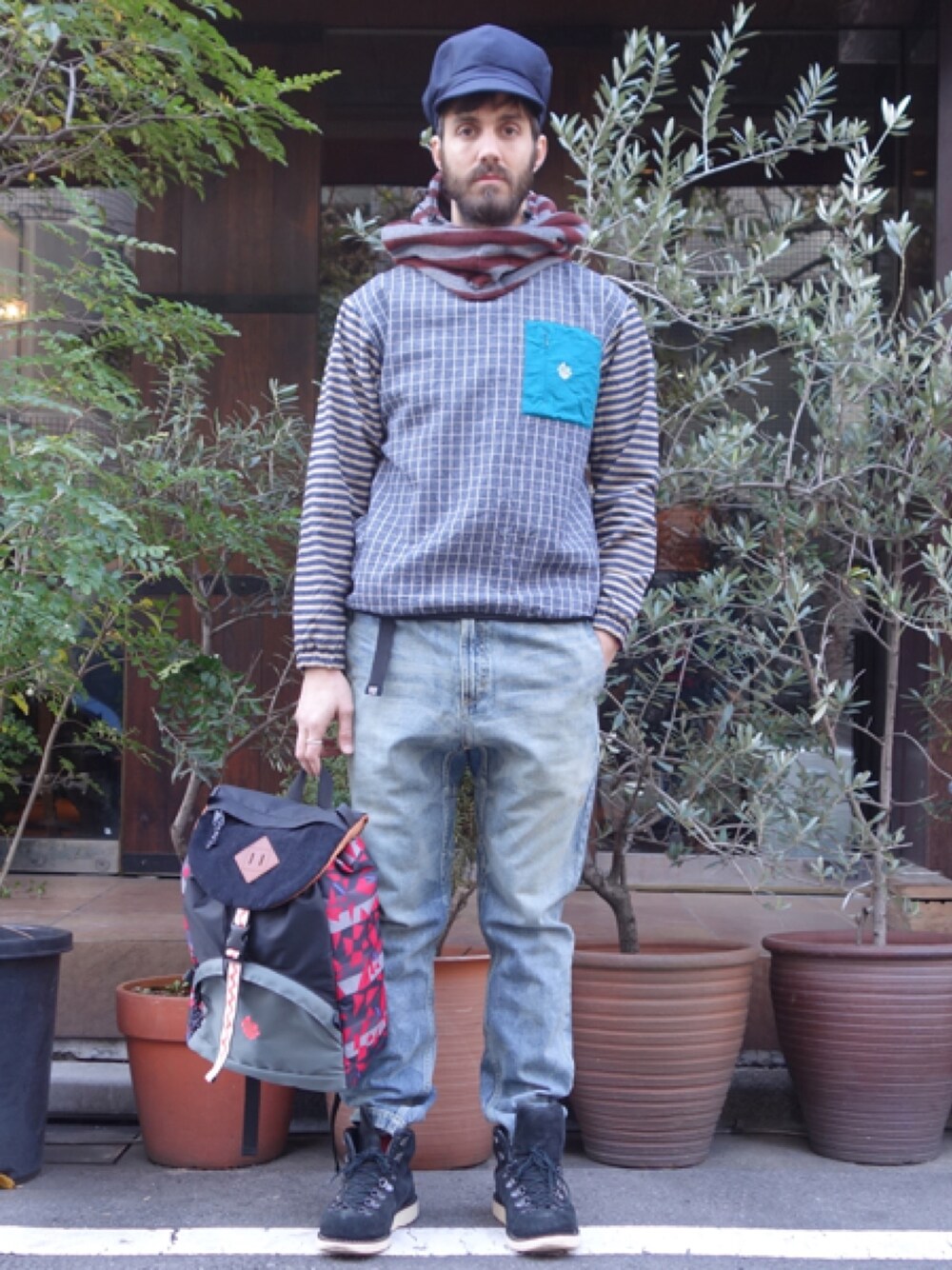 ネル素材のプルオーバーシャツが主役のコーディネート。