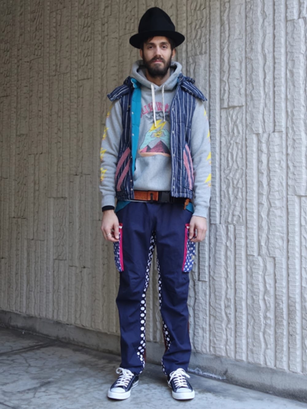 ベストとパーカーのコーディネート。