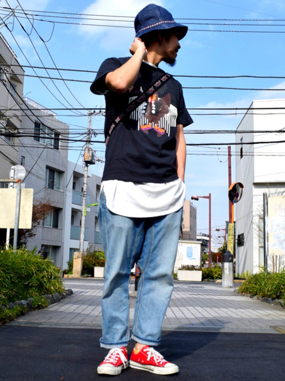 スタッフ・原田のコーディネート。 重ね着したロング丈のカットソーは、 実はレディースアイテムのワンピース。 近日ZOZOでも発売予定です!