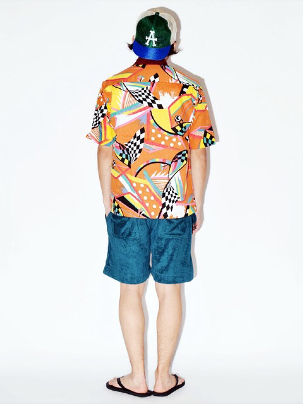 新作のパイルショーツと柄シャツを合わせたコーディネート。