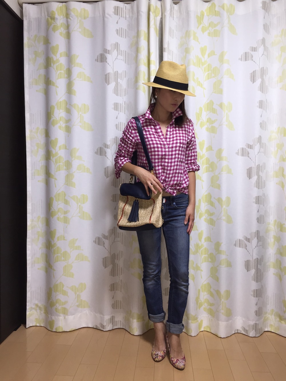 ラフでシンプルが一番👍🏻 だけど、足元は可愛くもしたくて😋 トップスのピンクに合わせピンク系の花柄パンプスを合わせれば、足取りも軽やかに〜🎈🎈