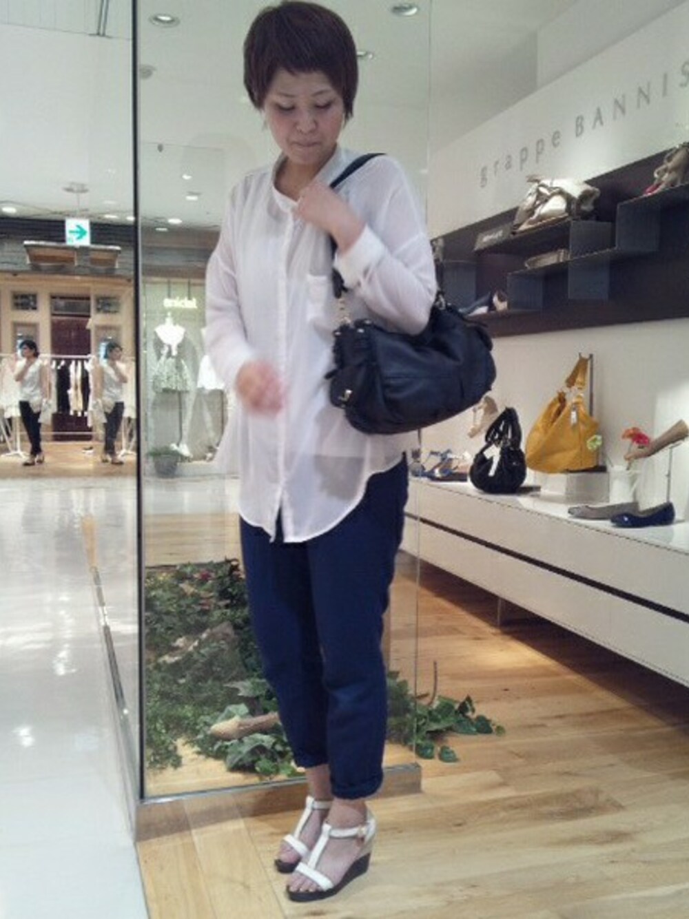 街ブラコ―デです♪ 今年トレンドの透け感のあるブラウスに オシャレなホワイトのサンダル×大人っぽいブラックの小ぶりなバックの合わせ サンダルは街ブラしやすいウェッジソール! バックは、ご旅行にもバッチリな斜め掛けもできる優れもの! こんなオシャレで街ブラしてみてくださいね♪
