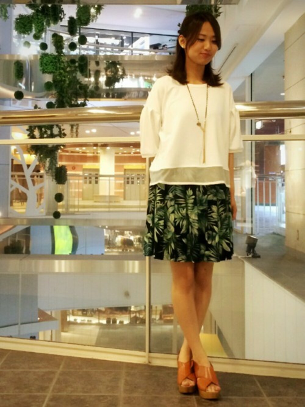 リーフ柄スカートには 今年のトレンドカラーの ホワイトで大人っぽくコーデ♡