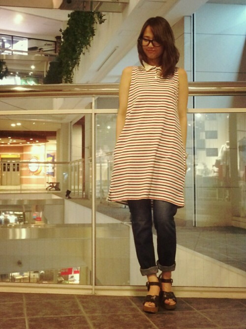 ボーダーのワンピースには スリムデニムと サンダルを合わせて 大人カジュアルスタイル♡