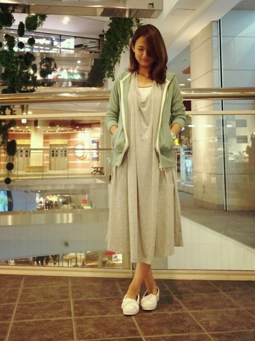 ドレープワンピースと パイルのパーカーで ゆったりコーデ◡̈♥︎ 足元は 白のミネトンカを合わせてみました!