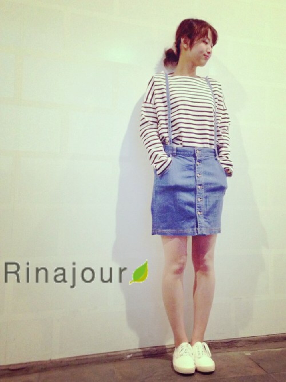 サスペンダースカートと ボーダーの組み合わせは 定番コーディネート♬
