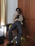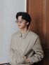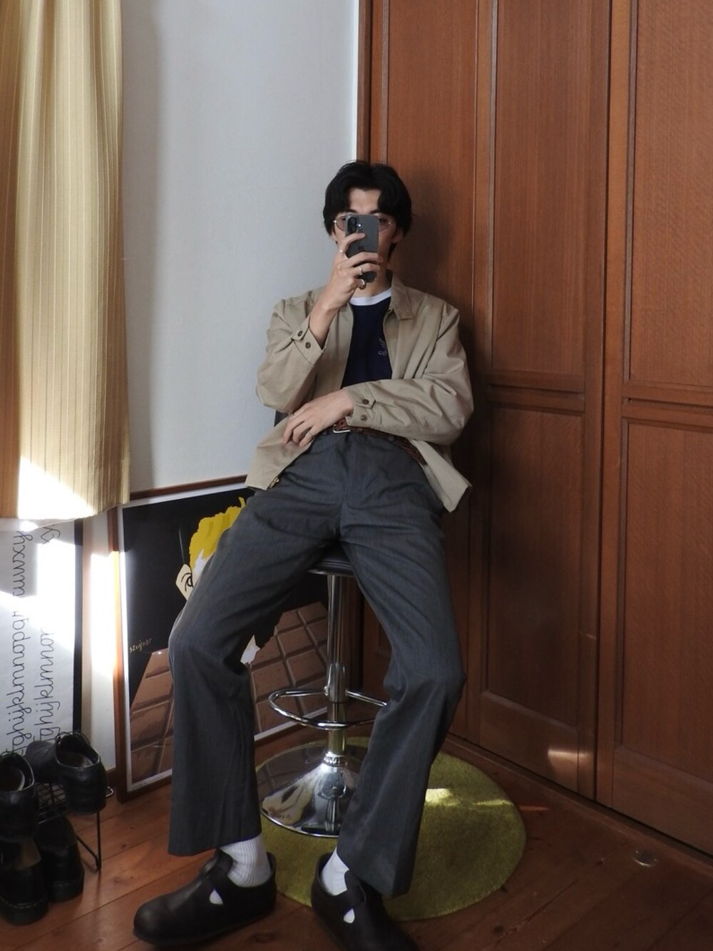 スラックスとベージュドリズラージャケットという大人ぽいコーデにアディダスTシャツを外しとして組んでみました