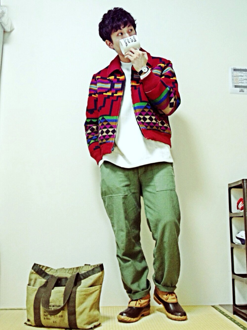 グリーン系のその他パンツを着用したメンズの秋コーディネートの1枚目の写真