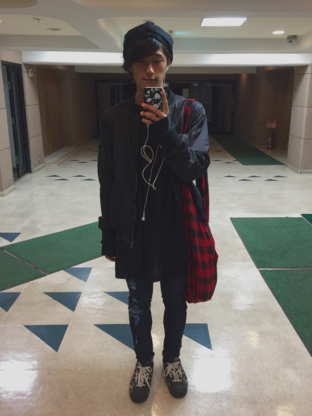 ハンチングキャップを後ろにして被ってます。 パンツは東京の古着屋さんで買わせていただいた Cheap Monday のパンツのブリーチ加工が施されたパンツです 下の黒のビックシャツは多分バスケのTシャツで5xlくらいの大きさでした。 上にはスタジャンを着ています 差し色として赤チェックのショルダーを使っています