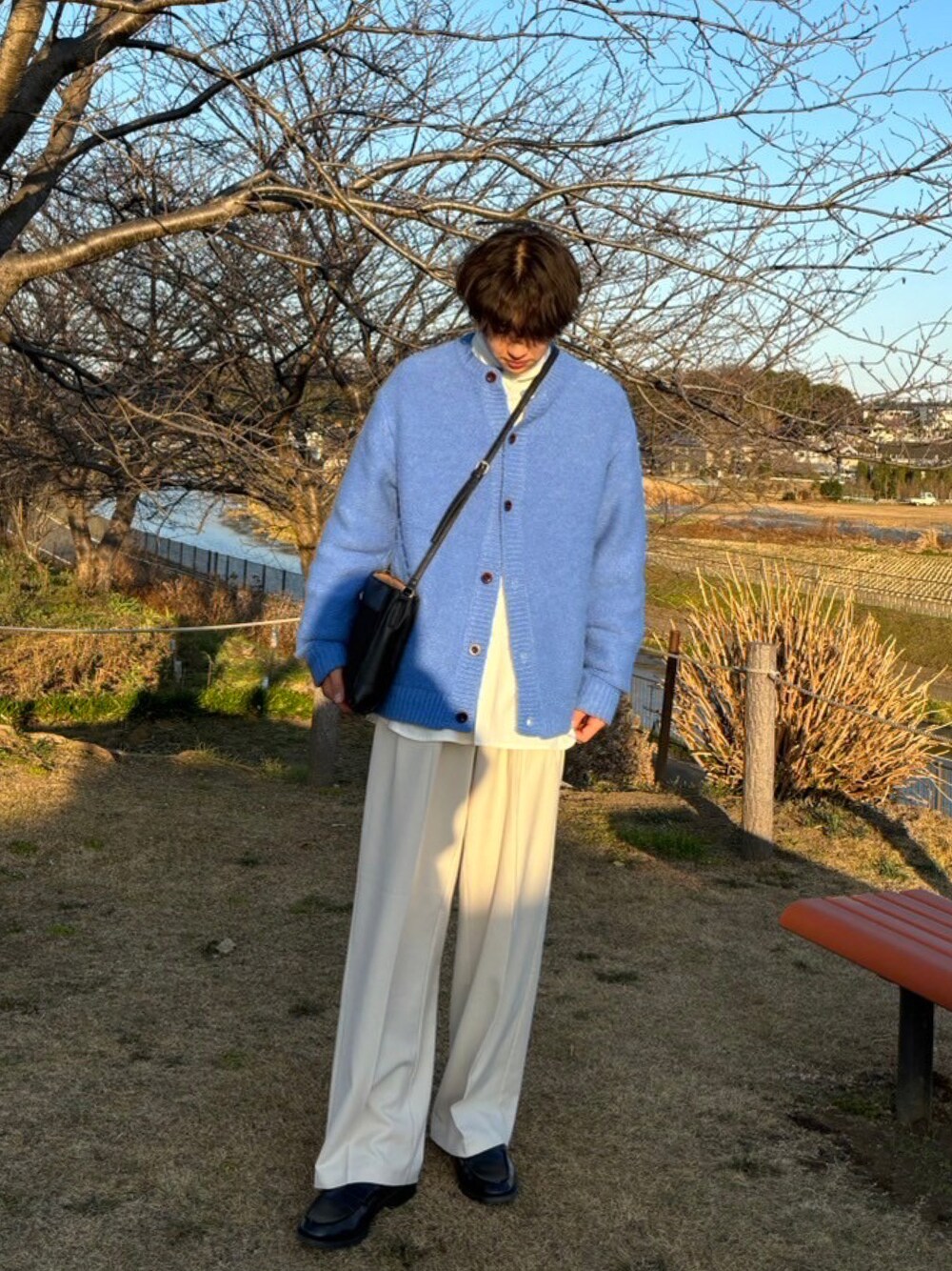 たつきのカーディガン/ボレロ「『ユニセックス』ブークレクルーネックカーディガン」を使ったコーディネート