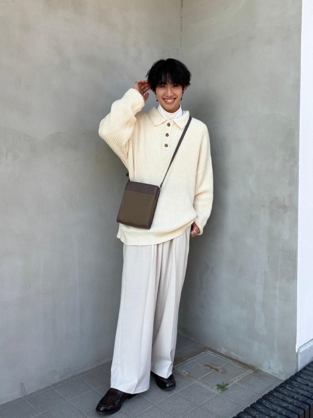 たつきのニット/セーター「オーバーサイズ ドロップショルダー ポロニットセーター」を使ったコーディネート