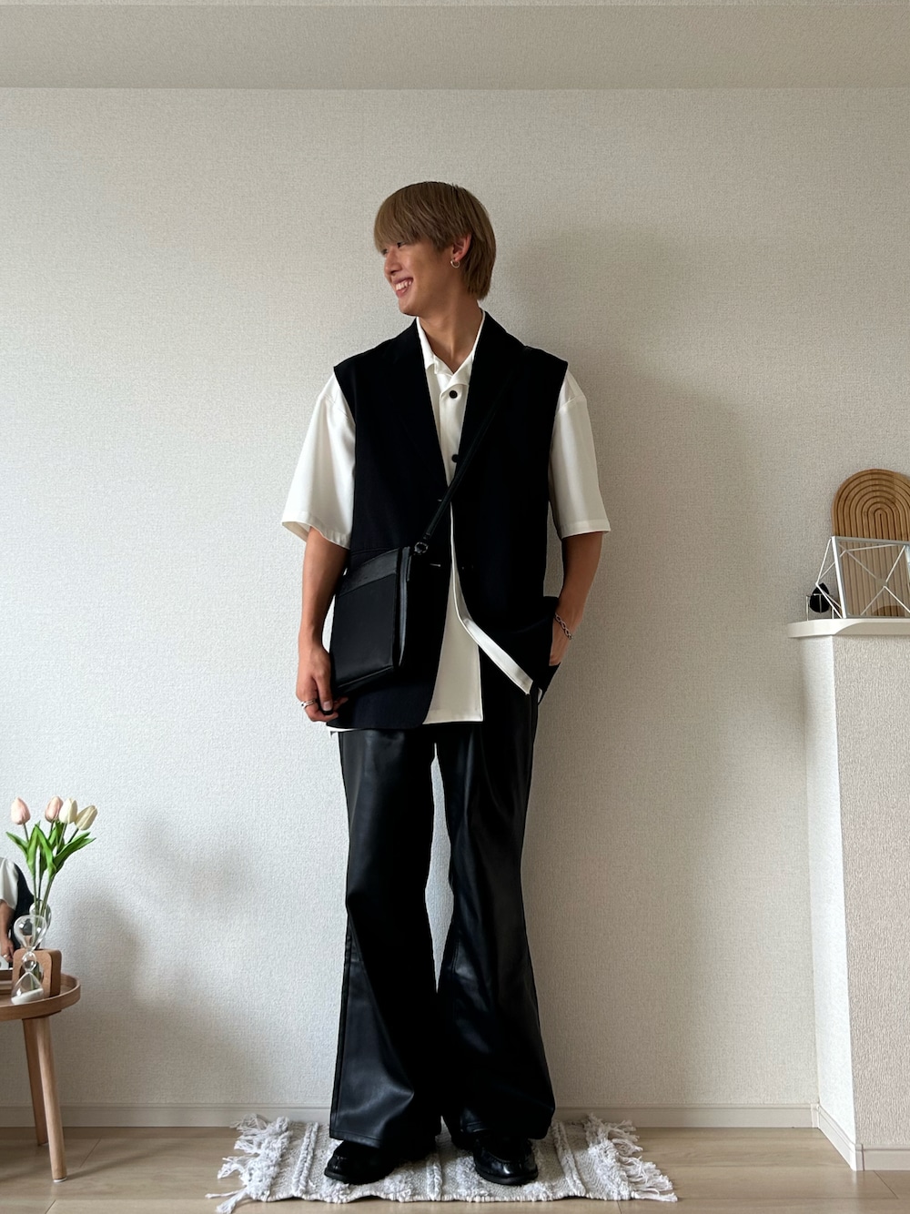 白のシャツに黒のジレを合わせました! このGUのジレ、レディースだけどサイズ感抜群に良いです🔥 Instagram → @82_tatsuki