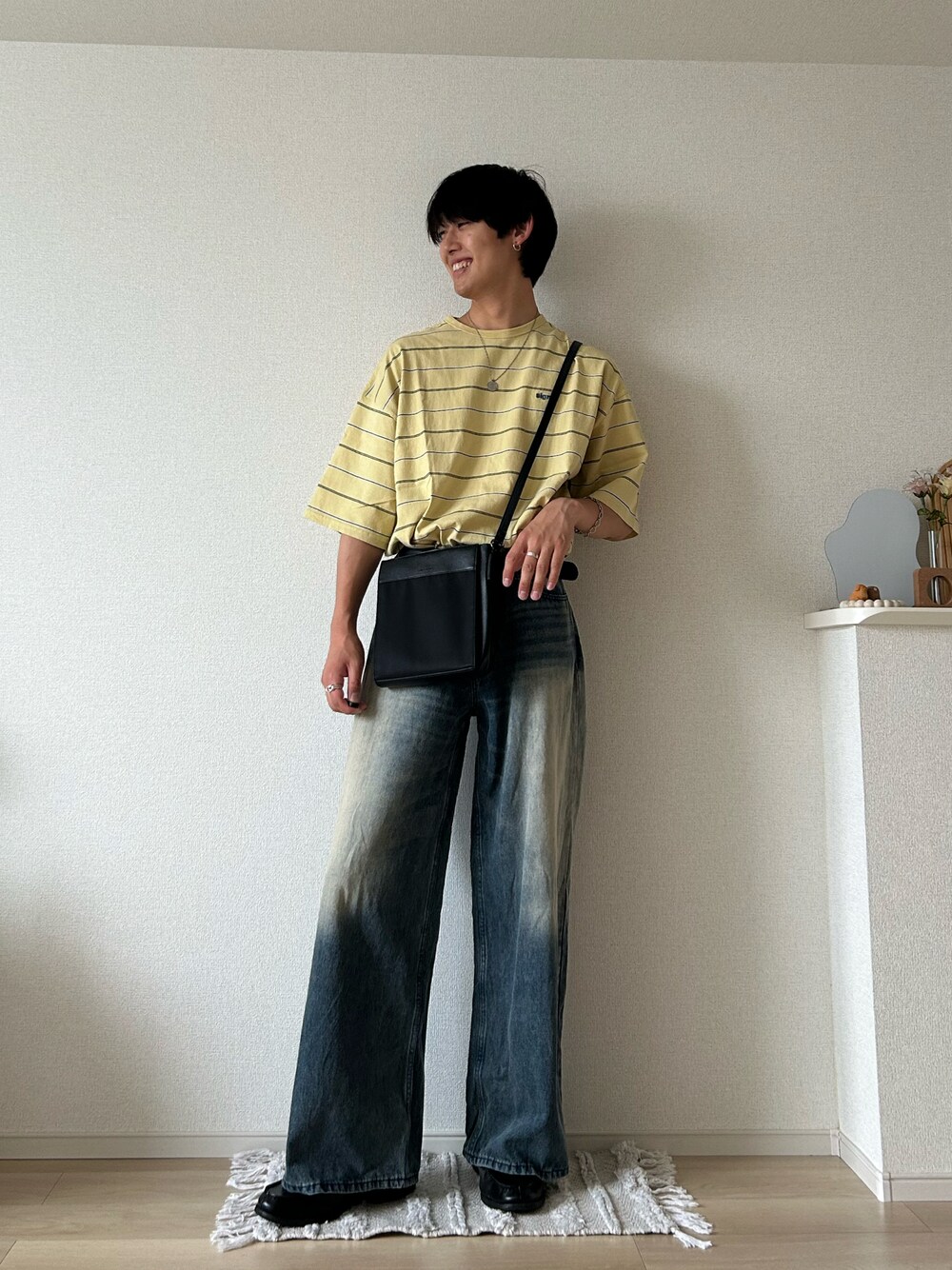 夏っぽい黄色のTシャツをデニムにタックインしました! デニムは夏も大活躍です🔥 TikTok → @82_tatsuki Instagram → @ts.82.fashion