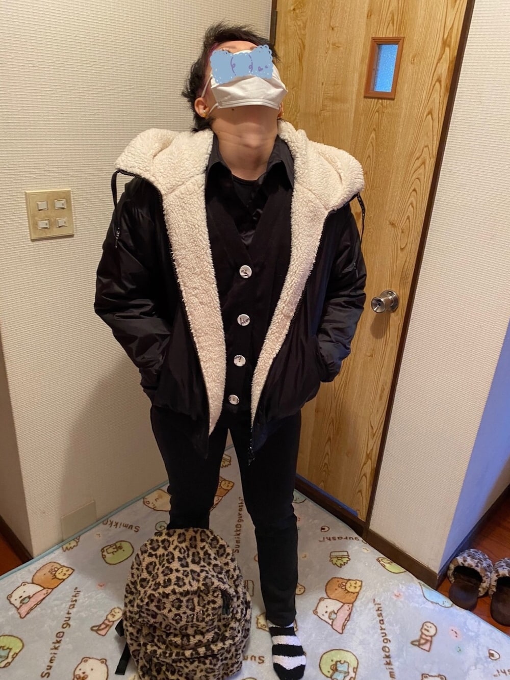2020.12.15 いつもと違うんですよ 気づいた人誰もいないと思うけど、 いつもはすっぴん 今日は化粧してるんです。 特に意味はないですけどね😝 なんかこのコーデ、足細く見えるな👀 嬉しい😆 今日は黒率高めにしてみましたよ✨ なんか #フライトジャケット 調べたら MA-1もありっぽかったから、着たいやつあったのに、どうやら既にわたしの手元にはないかも疑惑💦 画面右側のヒョウ柄🐆のスリッパ、サンキで今年ゲット💓気に入ってます。 今日の静電気 ⚡️小銭の受け渡しの際、先輩相手にバチッとなっちゃいました😖😭😢