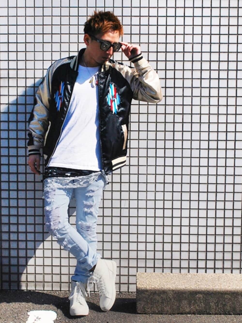 ネイティブ柄の入ったスカジャンに ダメージデニム➕レイヤードにはダメージTシャ ツを合わせています😉 【ネイティブ柄スカジャン】10.980円 【ダメージTシャツ】6.372円 【ダメージデニム】7.980円 【ハイカットスニーカー】6.980円