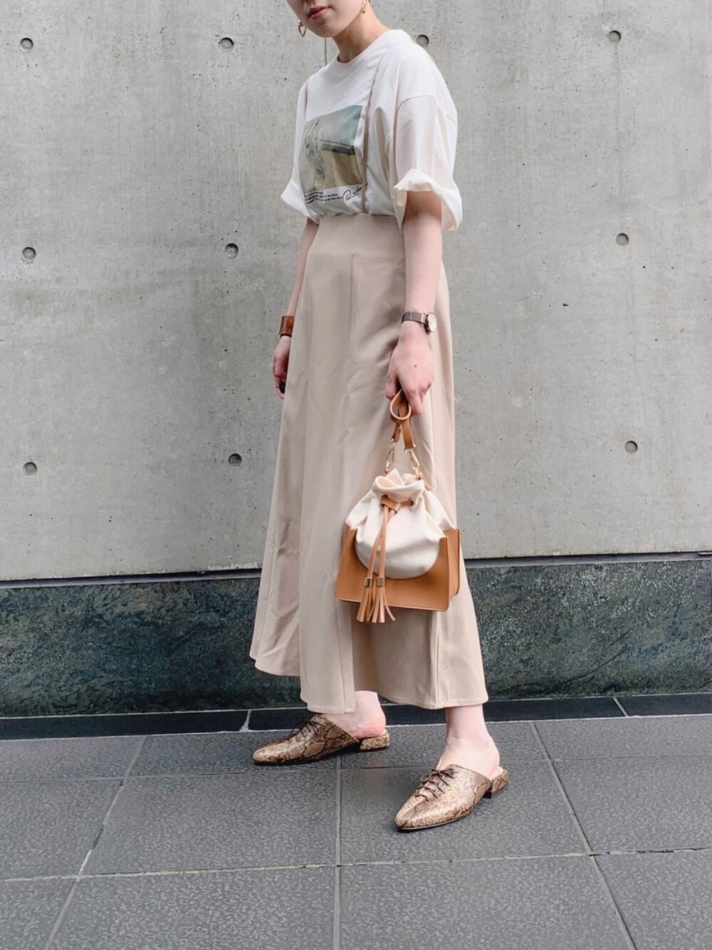 トレンドのフォトTシャツはゆったり着れるし、二の腕もカバーできる♡ サス付きスカートと合わせて女性らしさをプラスに♪