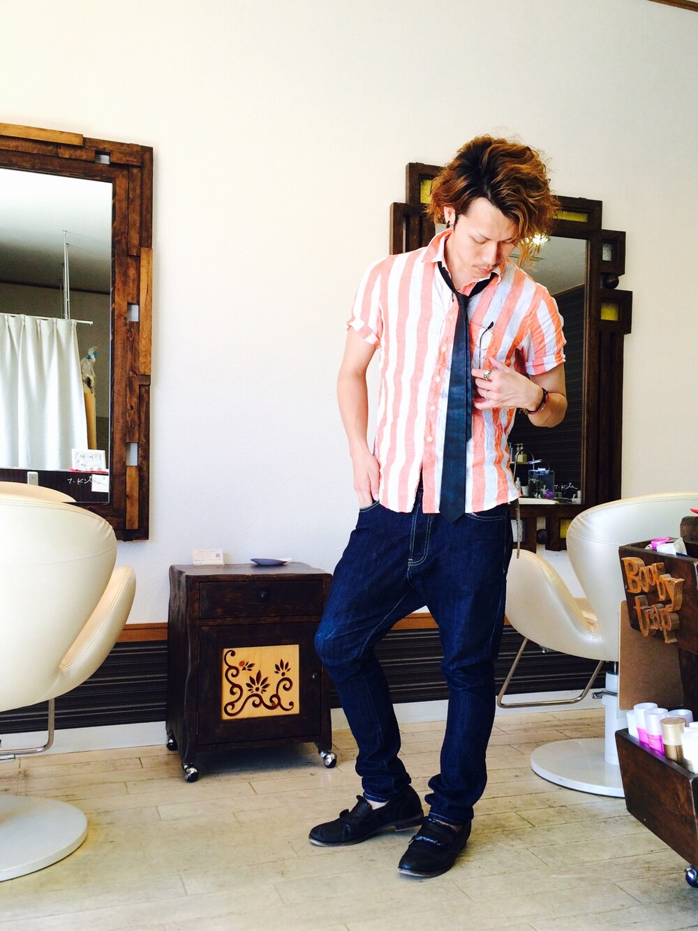 今日はものすごい日差し。 なので夏らしいオレンジのストライプシャツ主役に弾けすぎないように小物で締めてのコーディネート( ̄▽ ̄)