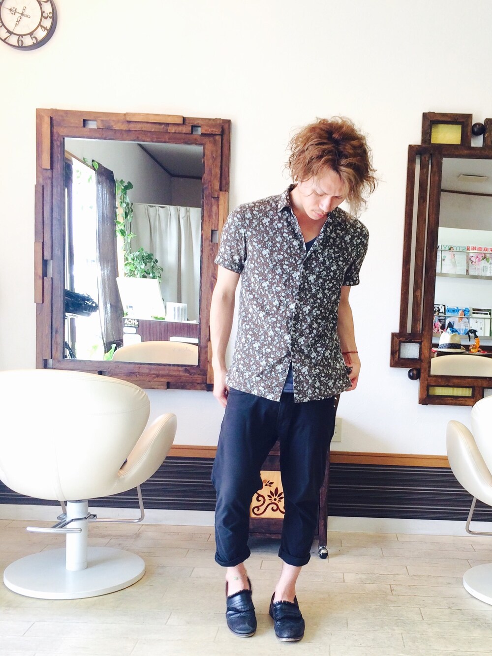 今日はかわいい花柄のシャツで♪ 黒パンツ、黒シューズで抑えてはみたけどチンピラ感は否めない気がするなー( ̄▽ ̄) 今日はこれに丸めがねつける予定だしなー。。 ビタミンカラーのアイテムが欲しい今日この頃。