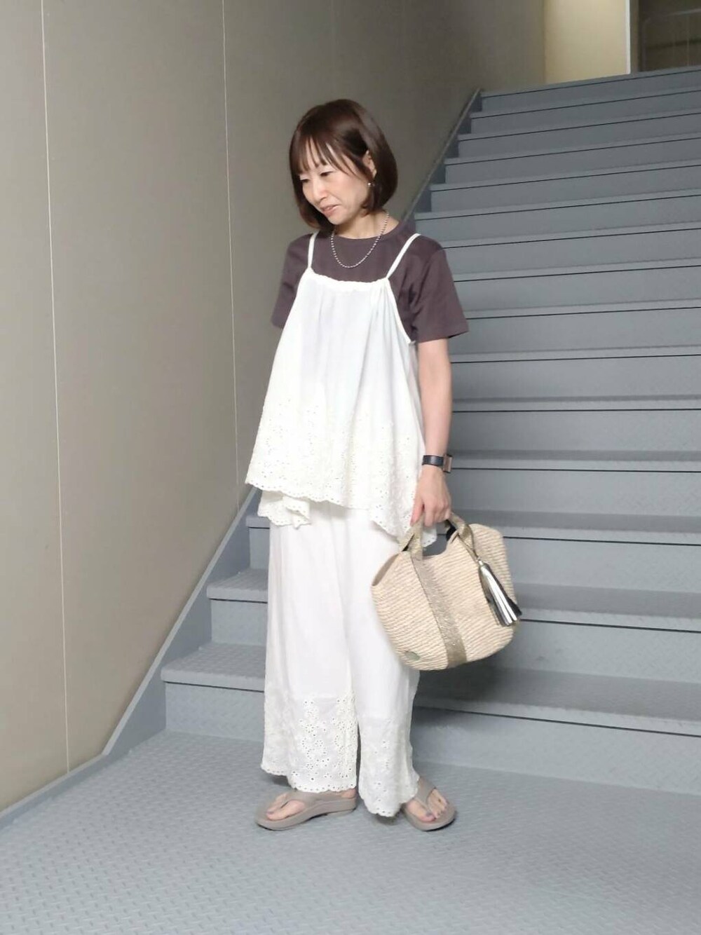 キャミ&パンツのセットアップの新作をご紹介します。お持ちのお洋服ともコーディネートしやすい嬉しいセット販売の商品です。 コットンでとても涼しく、柔らかい仕上げなので肌触りも◎ ウエストがゴムなので、一折した状態で履いています。白は若干透け感があるので、インナーの着用をオススメします。 旅行やお出かけに、このセットがあればコーディネートに悩むことはなさそうです!