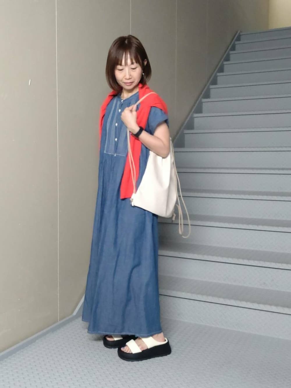 大人気、デニムピンタックワンピースが今年も入荷致しました!!とても柔らかい仕上げでサラッとしていて、夏にピッタリなデニムワンピースです。 フレンチスリーブなので、二の腕がスッキリと見えます!! これ一枚でコーディネート完成しちゃうところも嬉しいですよね。鮮やかな赤のカーディガンもポイントです。 綿100%なので、夏の日焼け対策にもぜひ!!