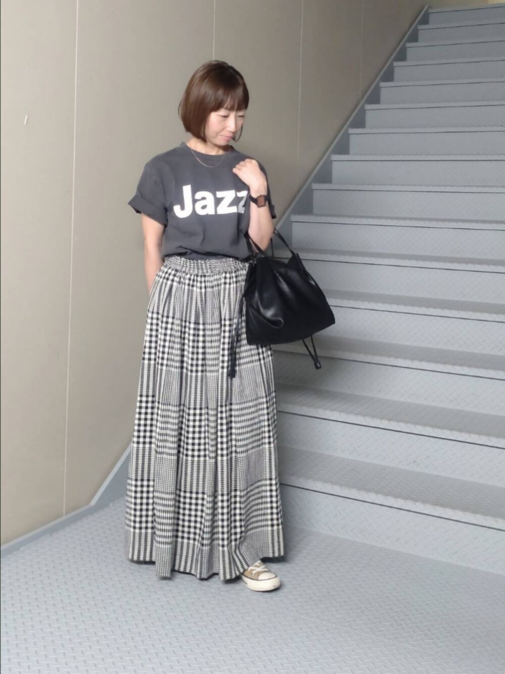 ギンガムチェックスカートは全体的にボリュームがあるので、特に小柄な方はコンパクトなトップスを合わせたり、Tシャツインをおすすめします。 足元はカジュアルなサンダルやスニーカーが可愛いです!