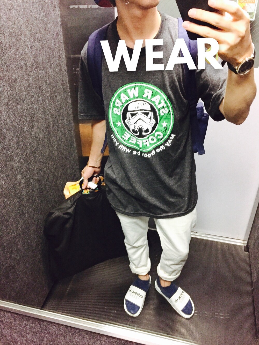 試練その99。 手抜き感がとんでもないコーデ。 白パンにパロディTシャツ。 あれ?もうすぐ試練その…