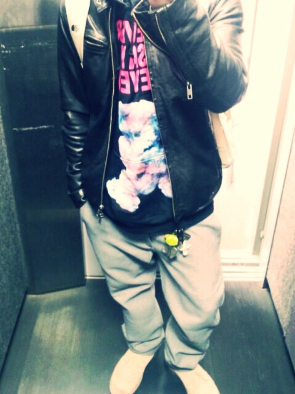 ライダース:オーダーメイド ニット帽:ドンキホーテ でっす。 今日も肌寒いですね。 朝からタモリさん目撃してウキウキウォッチングです。