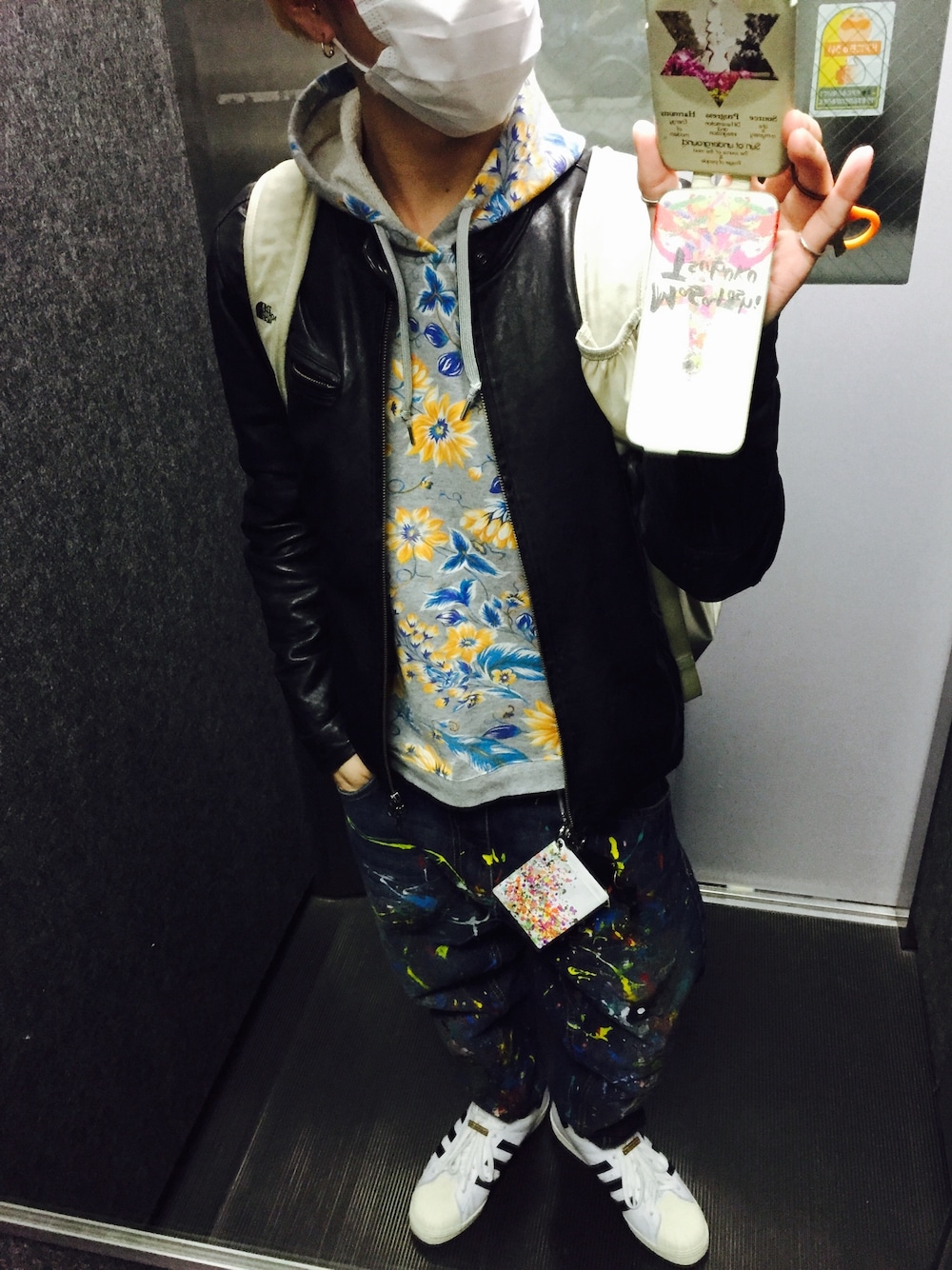 ボタニカル柄のパーカーとペイントデニム合わせたら柄柄感が凄いな。 ライダースで隠す。