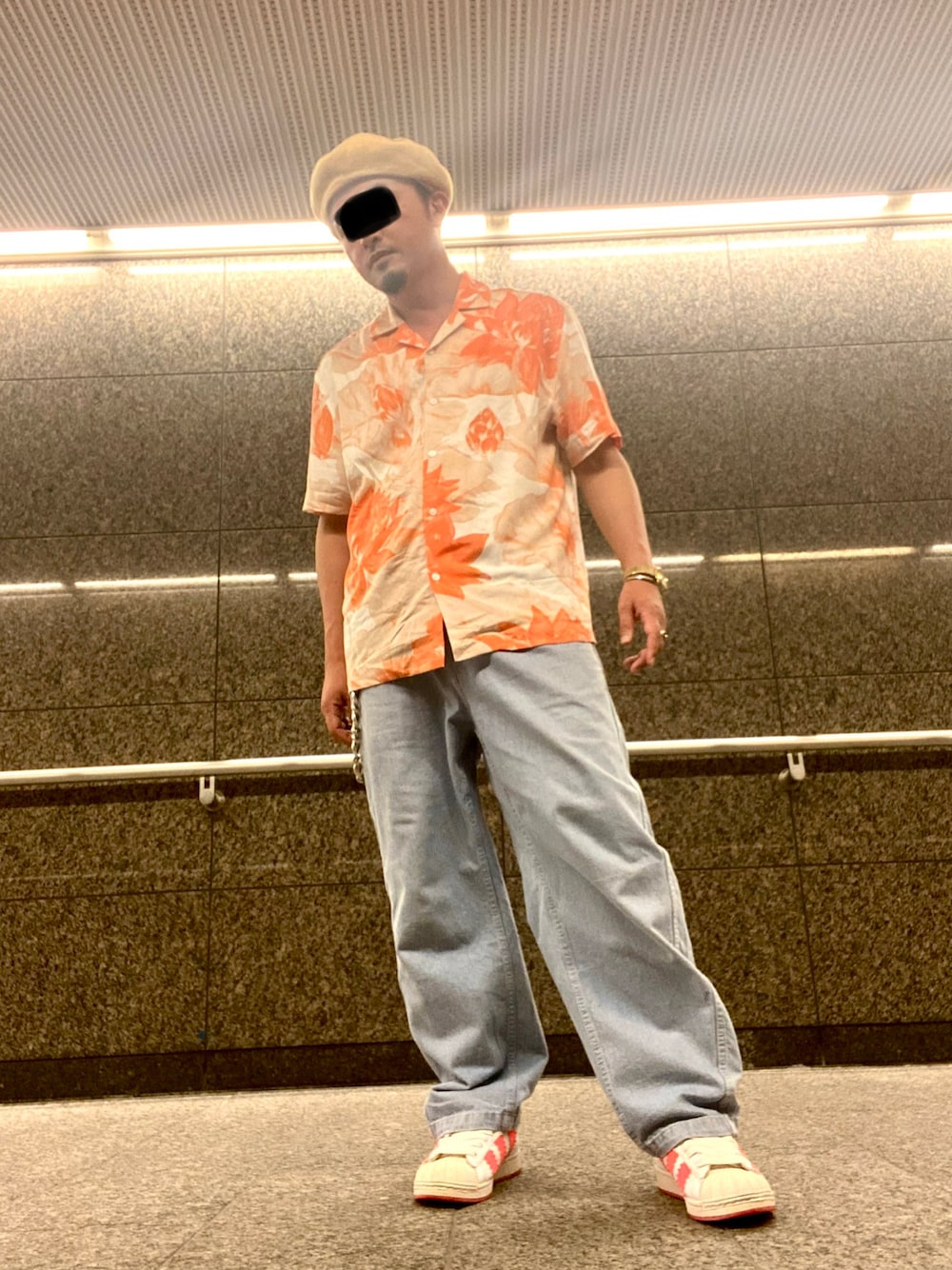 H&Mのアロハシャツを使ったリゾート的コーデ。 全体的に淡い色合いで統一しました。