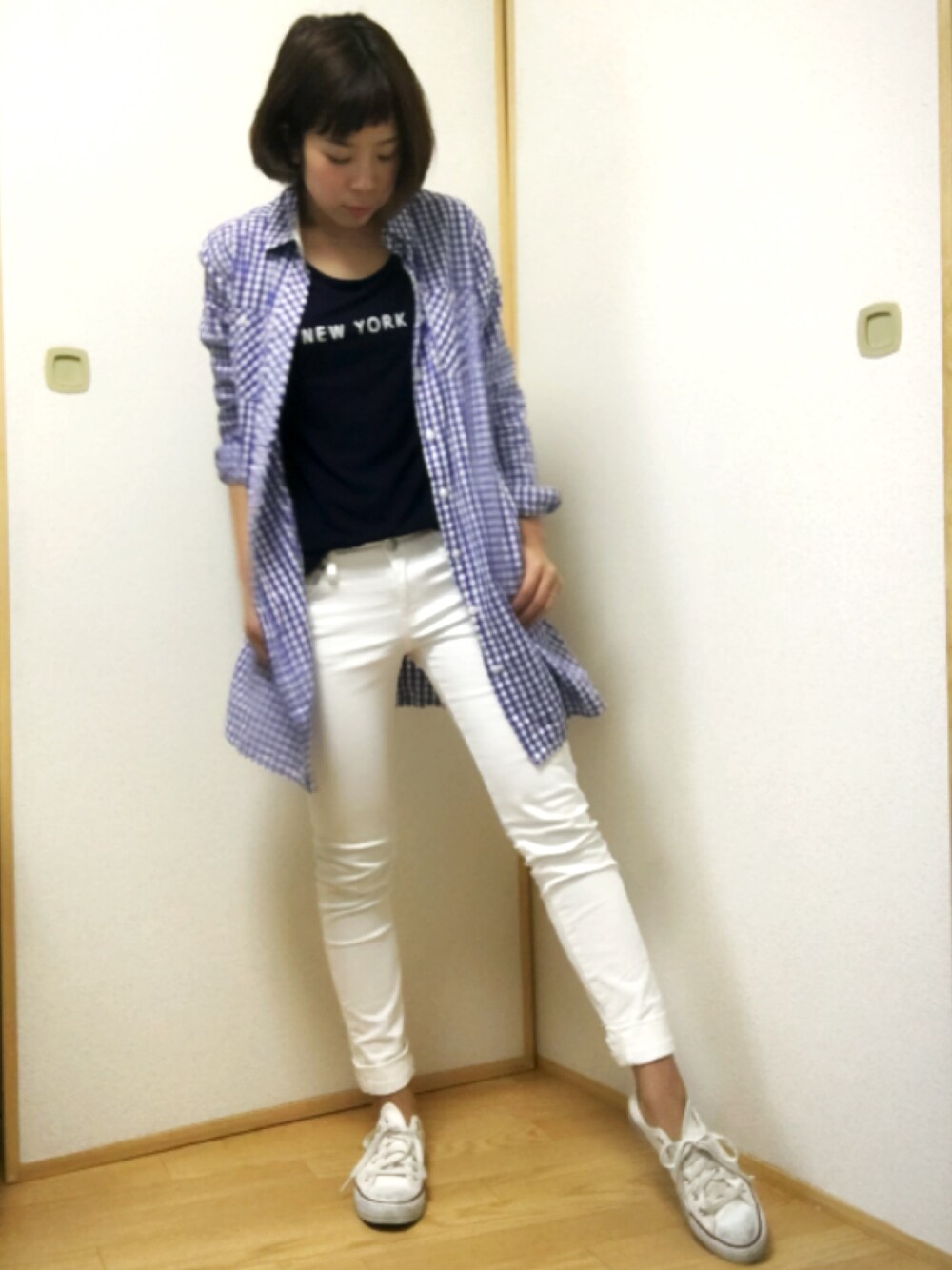 こんにちはーー! 今日は久々にシャツワンピを着用! ブルーのギンガムチェックで春っぽく🌸 白パンツ×Tシャツで シンプルに(^O^)