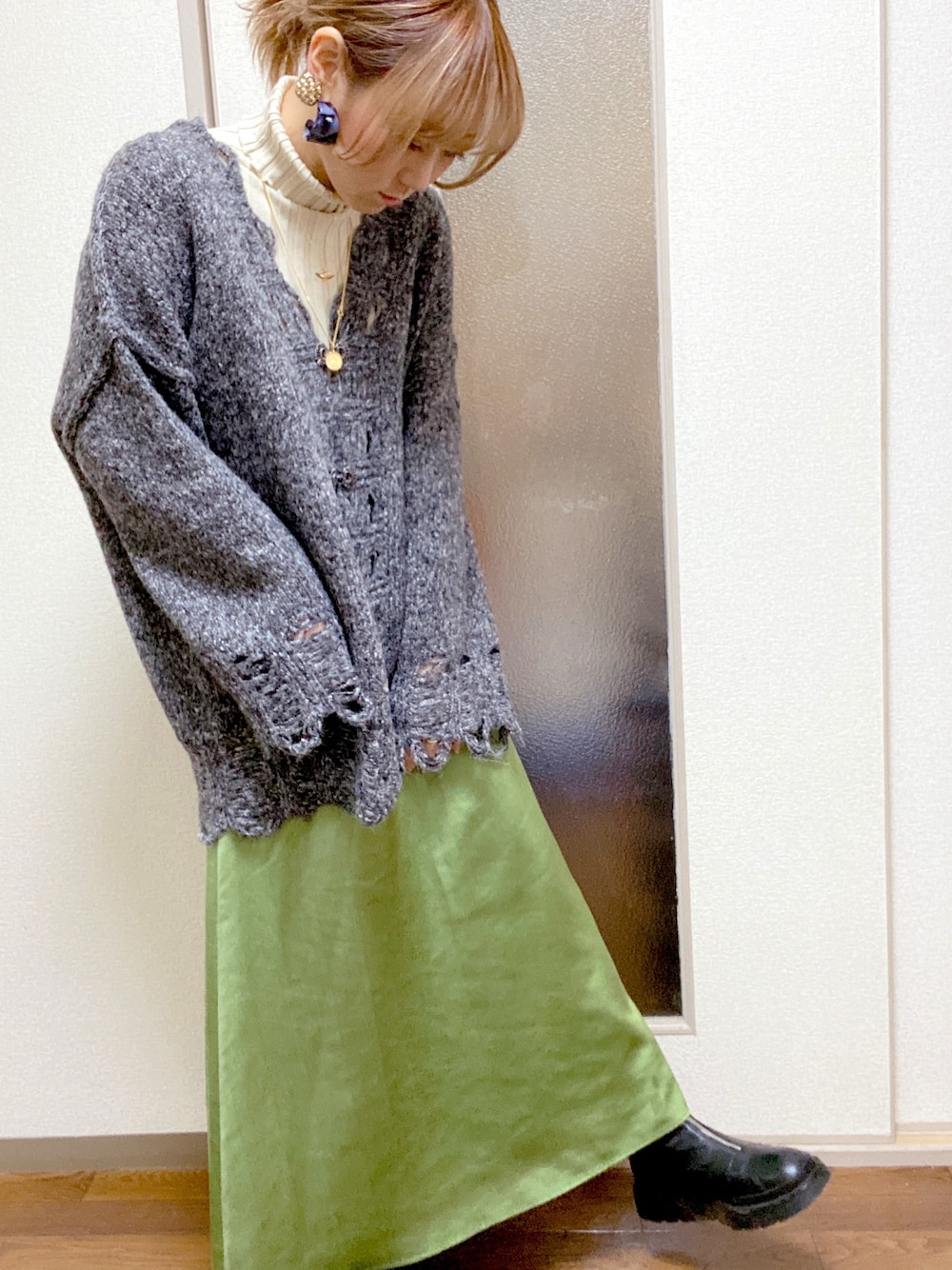 kakihana のカーディガン/ボレロ「リサイクルヤーンダメージMIXカーディガン/サスティナブル/チャイナ風ボタン/」を使ったコーディネート