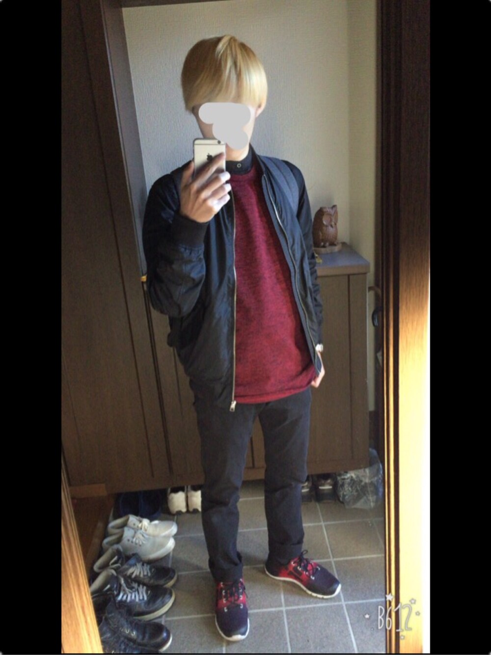 安定の赤黒コーデ。 リーボックpumpのこの配色がお気に入り。 最近やっとノーカラーシャツの魅力に気づいたしこれから増やそう。 白はマストで買っておかないとね。 襟のないMA-1にはノーカラーシャツで自然に。 セーターもUネックだからアウターを脱いでもラフなままで相性GOOD。